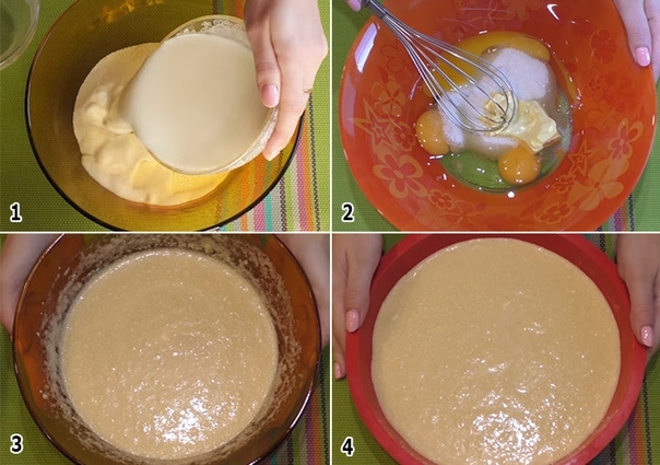 Яйца взбить с сахаром, солью и сливочным маслом.