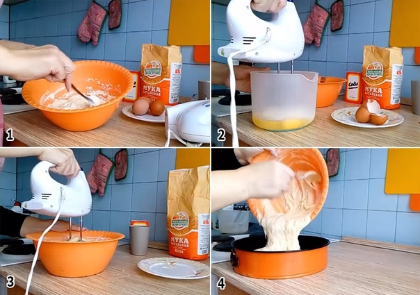 Добавляем смесь с сахаром и яйцами в миску с уже разбухшей манкой и всё перемешиваем миксером. Теперь добавляем соду, ванилин и муку, еще раз немного взбиваем миксером, чтобы не было комочков.