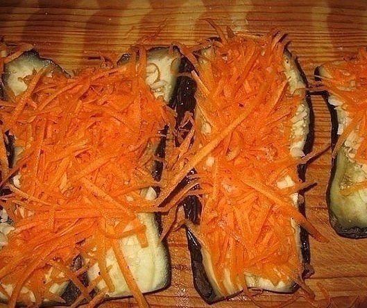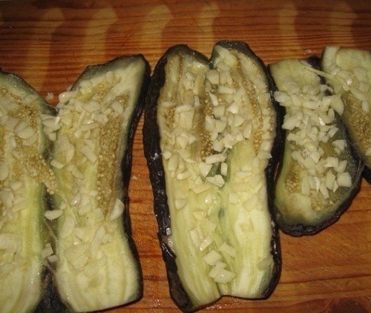 Достанем баклажаны из-под гнета и сделаем в каждом глубокий продольный надрез.