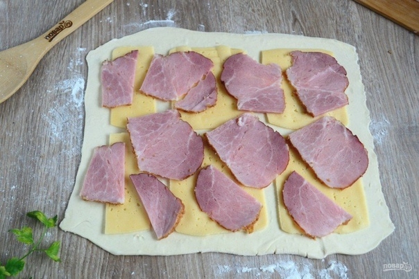 Выложите скачала ломтики сыра, а затем тонкие ломтики ветчины.