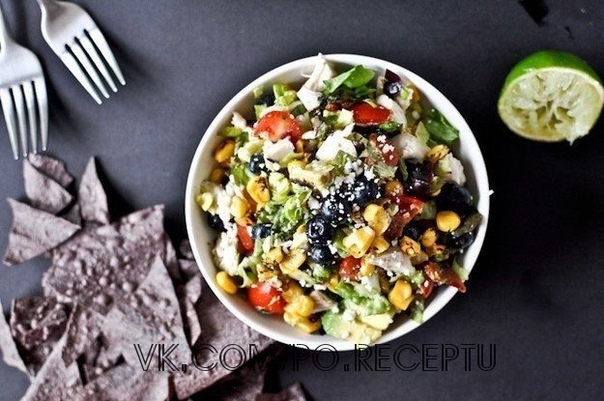 Порежьте куриную грудку, авокадо, бекон, помидоры-черри и салат. Смешайте в миске листья салата, кукурузу, курицу, авокадо, чернику, помидоры, бекон и сыр фета. Посолите и поперчите. Отдельно взбейте вместе сок лайма, мед, оливковое масло и уксус. Залейте этой смесью салат и хорошо перемешайте.
