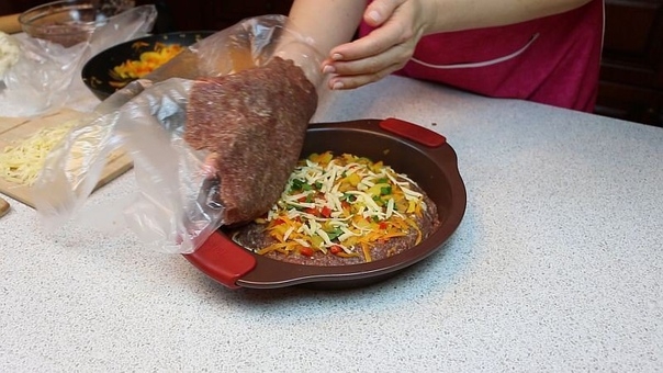 На крупной терке натираем кусочек тертого сыра. Собираем блюдо горочкой, слоями, для каждого слоя отделяем от фарша небольшой кусок и раскатываем между двумя слоями пленки в тонкую лепешку.