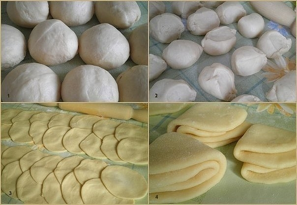 4. Для одной булочки берем 3 лепешки и складываем их пополам, а затем ещё раз пополам.