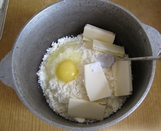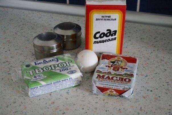 2. Затем добавляем в творог яйцо, сливочное масло, соду, соль.