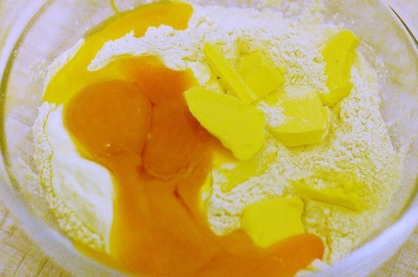 2. В муку выложить кусочки масла, сметану, сахар, желтки и цедру лимона.
