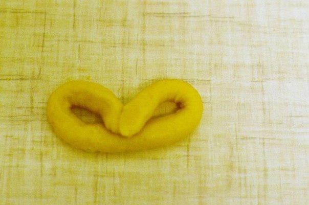 4. Отрывать по кусочку теста, раскатывать жгутик, складывать крендельком. Можно просто нарезать ножом или формой.