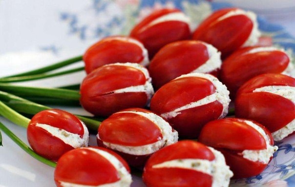 4. Маленьким ножом делаем аккуратные дырочки с той стороны помидоров, которая не надрезана. В получившуюся дырочку вставляем перо лука. Выкладываем получившиеся тюльпанчики на красивое блюдо.