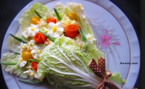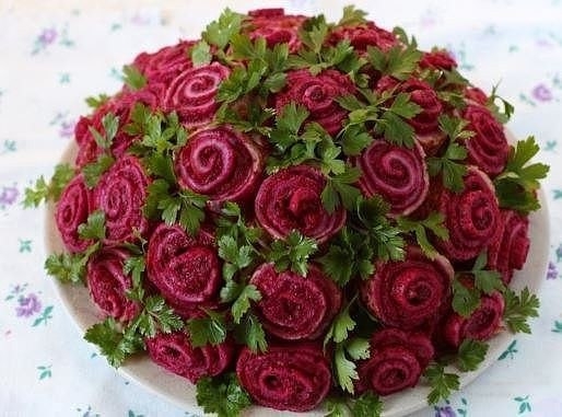 7. Аккуратно выложим цветы на салат и украсим петрушкой (вместо лаваша можно использовать испечённые на сковороде блинчики и цветы желательно делать перед самой подачей салата на стол).