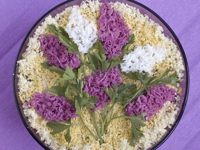 11. Остается украсить салат - десертной ложкой в виде букета выложить окрашенный и неокрашенный белок, украсить зеленью петрушки. Салат "Сирень" готов.