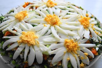 Сверху делаем ромашки таким образом: лепестки — из белков яиц, порезанных соломой. Середина цветка – это желток, натертый на терке. Салат украшаем сверху укропом.