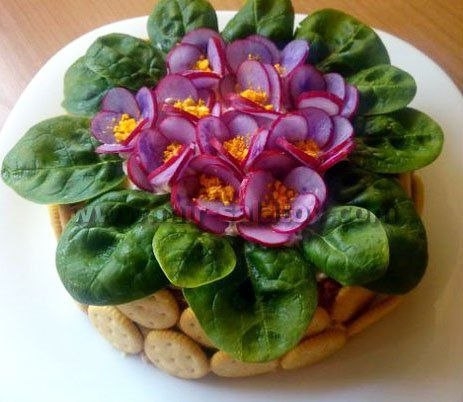 2. Фиалки делаются из редиса покрашенного соком синей капусты.