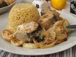 4.Форму смазываем маслом выкладываем рыбу,солим по вкусу,на рыбу выкладываем обжаренный лук