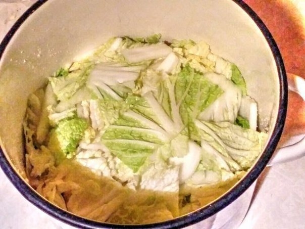 Отделяем верхние листья от кочана. Разрезаем каждый кочан на 4 части. Делаем рассол. В кипяток закладываем соль, кладем капусту в большую кастрюлю или таз. Заливаем ее остывшим рассолом. Рассол должен накрывать капусту, но она не должна в нем бултыхаться.
