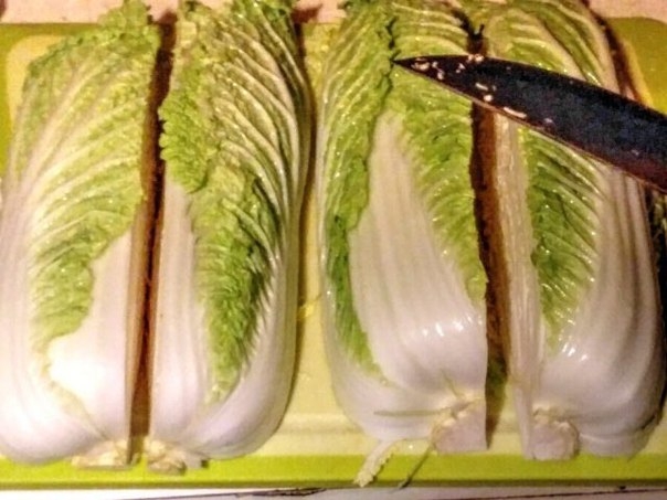Кладем поверх капусты тарелку или крышку. Оставляем ее мариноваться при комнатной температуре на 12 часов. Лучше делать это с вечера, чтобы утром она была готова для дальнейших действий. Перед сном переверните разрезанные кочаны, чтобы они промариновались со всех сторон.