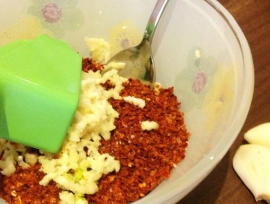 На следующий день доделываем начатое. Я взяла смесь перцев: красный чили и паприку. Лучше брать приправы крупного помола. Некоторые еще добавляют туда перетертый помидор. Но сейчас не сезон. Итак, давлю чеснок чеснокодавкой, кладу в смесь перцев. Досыпаю ложечку сахара. Можно долить соевого или рыбного соуса, если есть, либо немного воды. Нарезаю репчатый лук полукольцами, кладу в смесь.