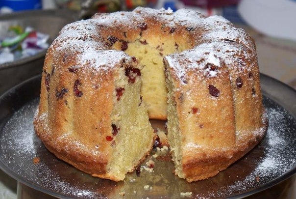 Все тщательно перемешайте и добавьте муку, смешенную с разрыхлителем и замесите тесто. Оно должно получиться, как густая сметана.К готовому тесту добавьте измельченные грецкие орехи и промытый изюм. Выпекайте при температуре 180 градусов примерно 50 минут. Кекс перед подачей можно украсить сахарной пудрой