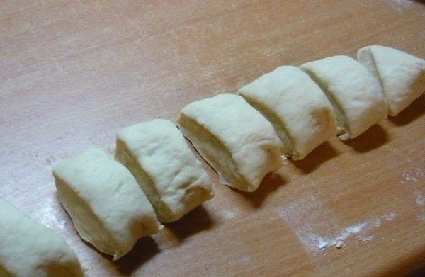 Отрезаем кусочек теста, обваливаем его в муке и раскатываем колбаску. Колбаску разрезаем на небольшие кусочки.