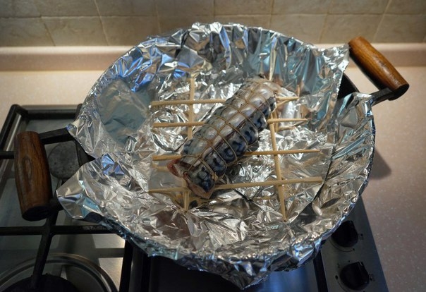 Выстилаем фольгой казан и "решетку" из китайских палочек для еды.
