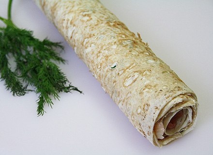 Накрыть вторым листом первый лист лаваша, равномерно распределить по поверхности оставшийся сыр, зелень укропа и ломтики лосося.