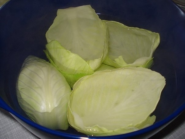 Разбираем капусту на листочки и заливаем крутым кипятком. Даём постоять 10-15 мин. Можно вместо этого лентяйского способа и отварить, но слегка!