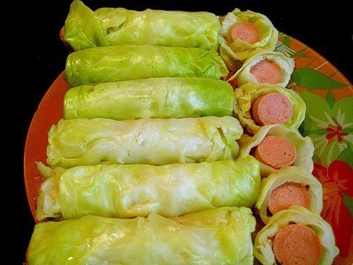 Листья капусты вынимаем из ещё горячей воды и обсушиваем. Они становятся податливыми к скручиванию. Заворачиваем в них сосиски – в каждый лист одну начинённую сосиску.