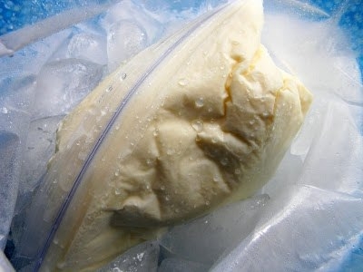Теперь немного волшебства. Соль и лед также смешай, отправь в большой пакет, следом засунь туда маленький пакетик со смесью для мороженого. Плотно застегни большой пакет.