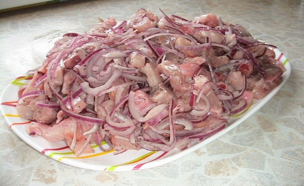 Далее рыба, ещё в замороженом состоянии, очищается от костей и шкуры, режется на правильные кусочки. Потом добавляется соль и перец. Можно, конечно, и предварительно просолить рыбу, но это, на самом деле, не принципиально. Отдельно, в разведённом уксусе, маринуется лук, нарезанный кольцами или полукольцами (способ нарезки - исходя из эстетического мировоззрения).