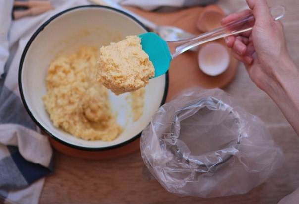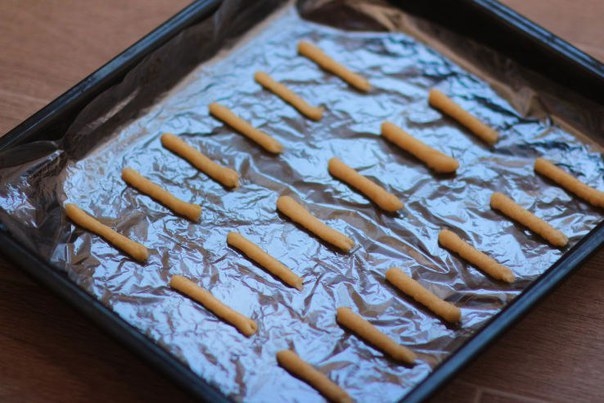 4. Переложить тесто в кондитерский мешок и отсадить на противень, застеленный пекарской бумагой, полоски размером 7-9 см.