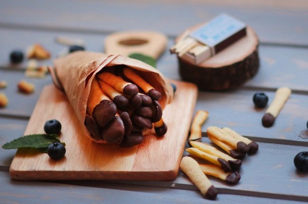 7. Окунуть в растопленный шоколад остывшие «палочки». Дать шоколаду застыть.