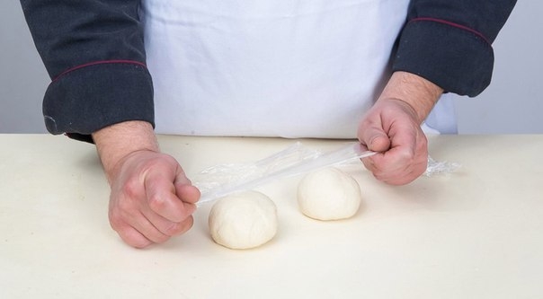 Примерно за час до начала выпечки достаньте тесто из холодильника, взвесьте и разделите на 2 или 3 части, в зависимости от желаемого размера пиццы. Сформируйте тесто в шары, прикройте пленкой и оставьте при комнатной температуре на 1 час, согреться.