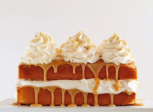 Накрыть вторым коржом, полить карамелью и с помощью кондитерского шприца, украсить торт сливками.