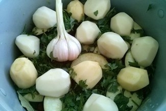 Также добавляем измельченную зелень, очищенный картофель и головку чеснока (если готовите в летнее время, то чеснок лучше возьмите молодой).