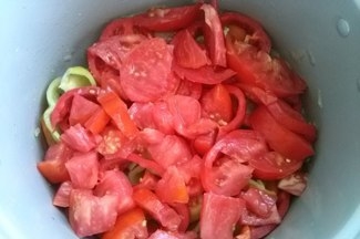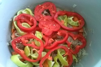 Вслед за морковью, добавьте болгарский перчик, порезав его кружочками. Можно взять несколько перцев, разного цвета, чтобы придать блюду красочности.