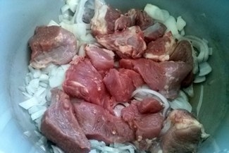 Хотя готовить это блюдо желательно на открытом огне в казане, как упоминалось в самом начале, мы будим готовить его в мультиварке. Но Вы всегда можете повторить его в оригинальном исполнении, если есть желание и такая возможность. И так, включите мультиварку в режиме "Тушение" на 90 минут. Налейте в чашу немного растительного масла, и обжарьте в нем порезанный полукольцами или кольцами лук до прозрачности.
