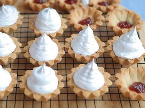Выпекаем тесто в заранее разогретой до 170 градусов духовке, до золотистого цвета. Готовое тесто вынимаем из духовки, даем ему постоять 3 минуты и вынимаем из формочек. Когда тесто остынет, кладем в него начинку из варенья или джема (желательно с кислинкой).