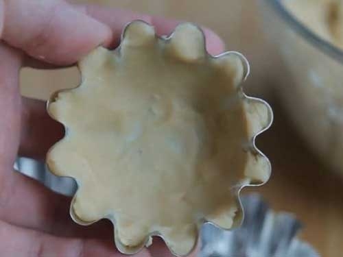 Готовое тесто выкладываем в формочки, распределяя тонким слоем. Формочки смазывать маслом не надо, так как тесто получается жирным и не прилипает.