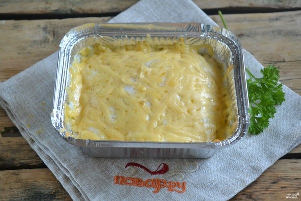 Сверху присыпьте тертым твердым сыром, отправьте в разогретую до 180 градусов духовку на 30 минут.