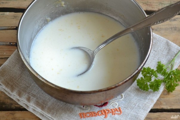 Добавьте мускатный орех, а сразу же за ним влейте молоко, посолите. Хорошенько размешайте и уваривайте до загустения. По консистенции соус должен получиться похожим на сметану.