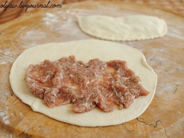 4. Разогреть масло в глубокой кастрюле или в воке. Кусочек теста немного помесить, сформовать шарик, придавить ладонью, затем раскатать тонкий круг, размером с блюдечко, на одну половину распределить фарш.