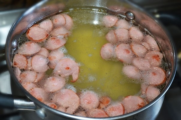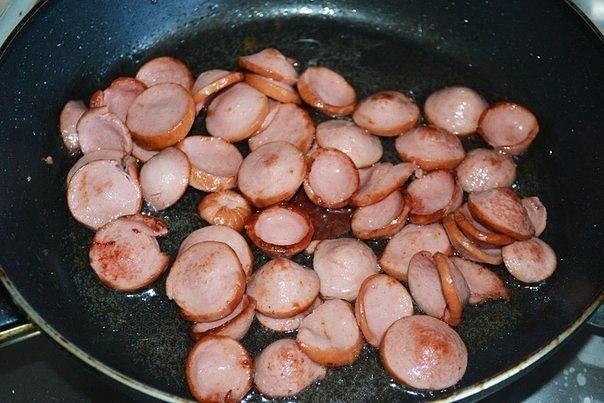 2. Сосиски нарезать кружочками. Обжарить на растительном масле. Затем обжаренные кружочки сосисок переложить в кастрюлю с картофелем.