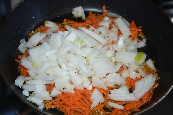 3. Морковь натереть на тёрке. Лук нарезать кубиками среднего размера. Выложить в сковороду с растительным маслом. Лук и морковь обжарить 10 минут. Затем к овощам добавить томатную пасту. Тушить вместе с томатной пастой 5-10 минут.