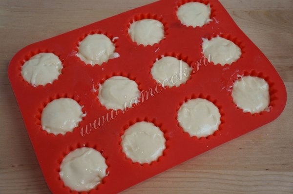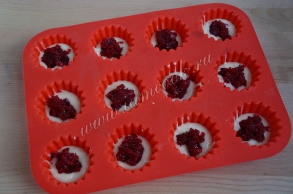 Духовку греем до 180°, готовим формочки...И заполняем формочки так:- по 1 с.т. теста в каждую формочку;- по 1 ч.л. варенья на тесто;- остаток теста распределить по формочкам - тесто должно полностью покрывать варенье.Остаток сахара (40 г) и корицы (1 ч.л.) смешать и посыпать смесью кексы.