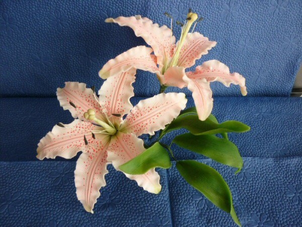 Формируем лилию. Небольшим кусочком мастики оборачиваются тычинки вместе с пестиком, крепится также половина лепесточков.