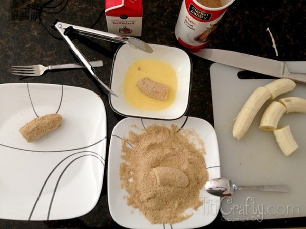 Обмакните бананы в яичную смесь и подержите немного в воздухе, чтобы стекли излишки смеси. Окуните кусочки в хлебные крошки, слегка вдавливая их. Опять окуните бананы в яйца и снова в крошки. Выложите на вощеную бумагу.