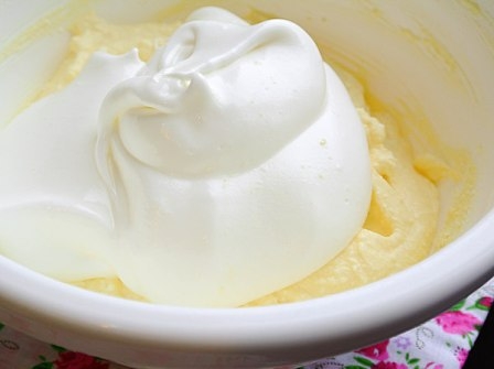 6. Белковая масса добавляется в творожную и аккуратно вмешивается движениями снизу-вверх, дабы белки не осели.