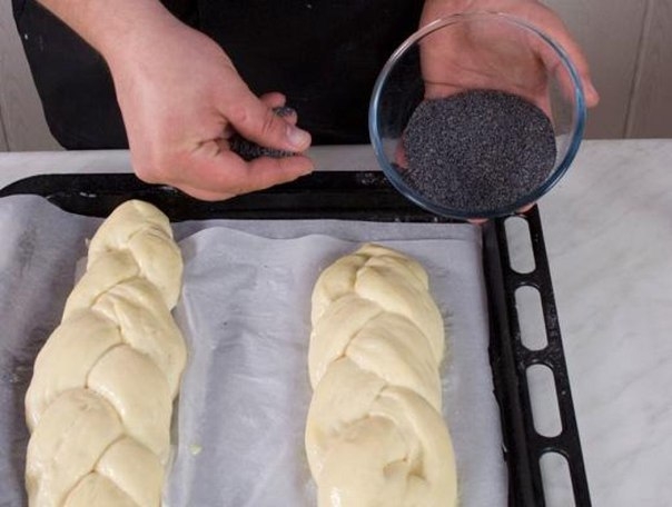 Изделие смажьте смешанным с водой яичным желтком и густо посыпьте маком или кунжутом. Выпекайте 30 минут при 180 °C. Готовую халу уложите на решетку и накройте полотенцем, дав постоять.