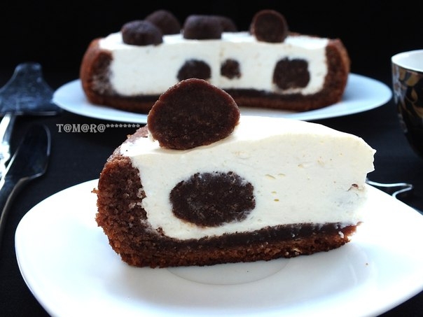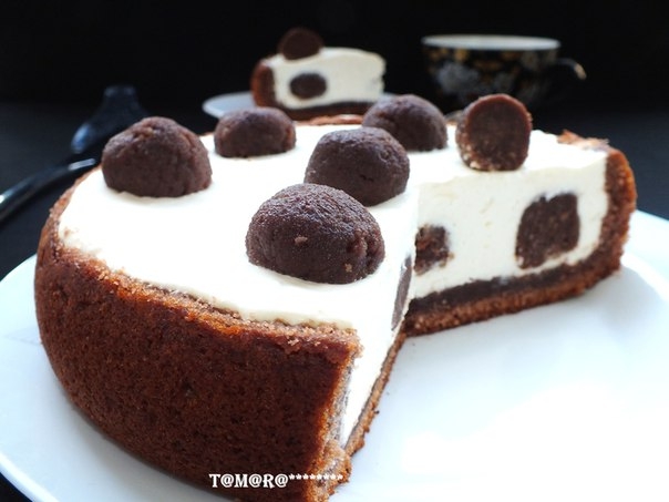 12. Заливаем нашу бисквитную форму слоем творожной начинки, затем выкладываем шоколадные шарики, сверху накрываем оставшейся творожной массой. Украшаем сверху оставшимися "трюфельками". Убираем в холодильник на час.Приятного чаепития!