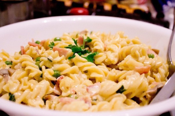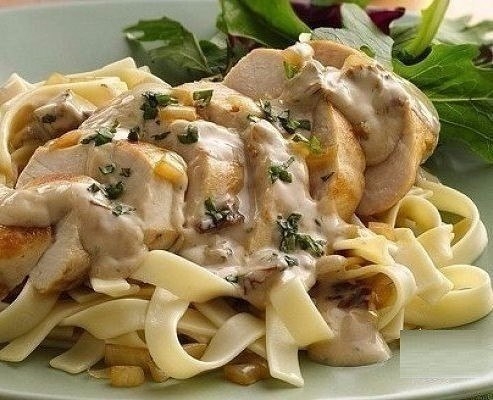 5. Тем временем отварите пасту до состояния аль денте, слить воду, добавить макароны к готовой куриной грудке и аккуратно перемешать. Подавать, украсив зеленью.