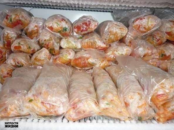 Пусть вас не смущает наличие помидоров, они при замораживании становятся немного другими, но вкус дают замечательный. Все нужно нарезать соломкой и кубиками. Морковь пропустить через комбайн, на средней тёрке (почти как на корейской получается, но можно тереть как хотите), перец нарезать соломкой. Помидоры и лук режем средними и мелкими кубиками. Зелень просто мелко режем. Всё перемешиваем. Складываем в обычные полиэтиленовые пакеты и скручиваем "колбаски" (так удобнее потом отламывать столько сколько вам нужно). Можно замораживать в пакетиках для завтраков, они небольшие - 15Х20, как раз или на 1 или на 2 раза заправить блюдо. Можно замораживать и в пластиковых контейнерах, но из них потом не очень удобно извлекать порции и, что немаловажно - они гораздо больше занимают места в морозилке. ВАЖНО! Запускать эту заморозку, когда всё уже готово. Если это первое блюдо, то кладем заморозку, ждем когда закипит и сразу же выключаем. А если второе, то кладем заморозку, перемешиваем и через пару минут выключаем .