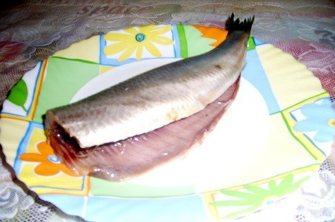 1. Для начала у селёдки удалим голову, разрежем ей брюхо, очистим от внутренностей и промоем под водой.